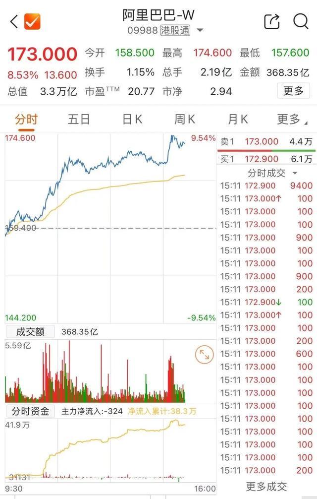截至发稿,阿里巴巴港股大涨超8%,最新股价报173港元/股,盘中最高报174.6港元/股。