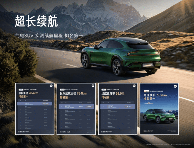小米YU7在上市后经历了业界罕见的"百万严选"大考,在易车、汽车之家、懂车帝三大权威汽车媒体的测试中共计取得13项第一名,涵盖加速、续航、操控、补能、制动等多个核心性能维度。在用户最关心的续航方面,小米YU7表现尤为突出:在易车和汽车之家的测试中均取得784km的续航成绩,位列SUV类别第一名;在懂车帝的高速续航测试中也以652km的成绩获得SUV类别第一。