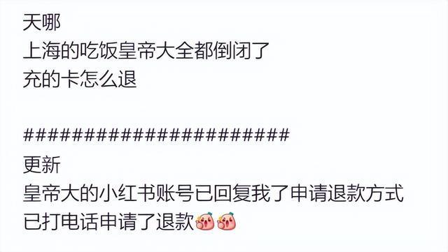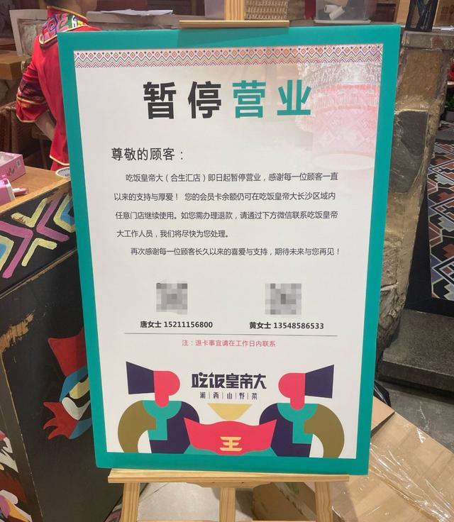 另据店铺贴出的公告显示,会员卡余额仍可在吃饭皇帝大长沙区域内任意门店继续使用,办理退款可在工作日内联系工作人员。
