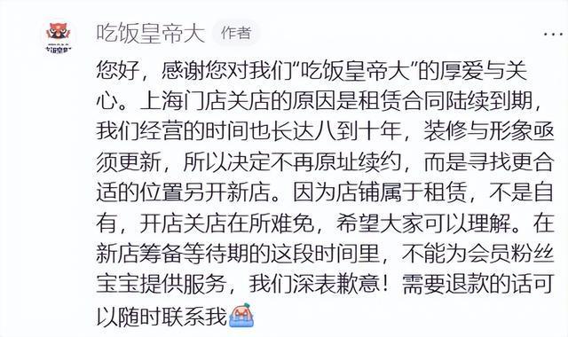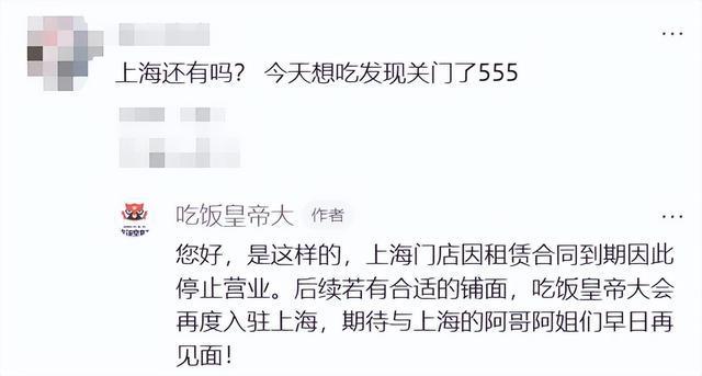 此外,针对上海闭店情况,“吃饭皇帝大”官方也在某社交平台回复网友称,“上海门店因租赁合同到期因此停止营业。后续若有合适的铺面,吃饭皇帝大会再度入驻上海,期待与上海的阿哥阿姐们早日再见面!”