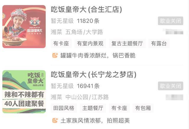 查询发现,上海市“吃饭皇帝大”三家门店均显示歇业关闭,拨打了上海三家门店联系电话,均已暂停使用。