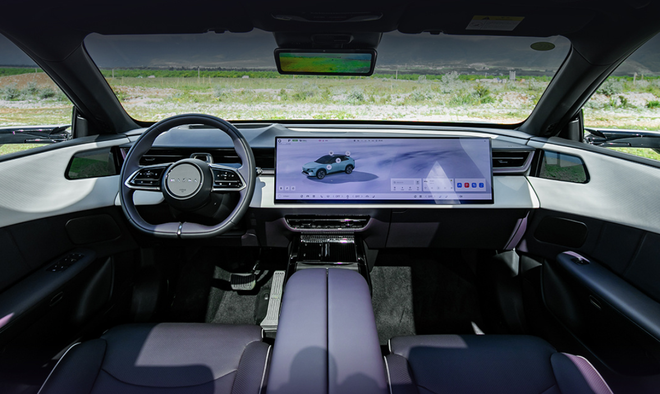 内饰方面,整体为极简科技风。车内配备26.45英寸的5K一体式大屏,屏占比达88.3%,拥有超窄边框、超薄触感和超快响应速度。