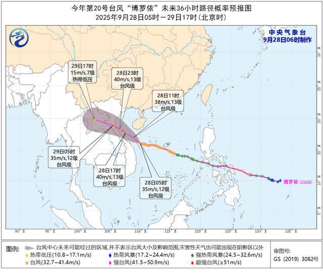 中央气象台9月28日10时继续发布台风黄色预警:预计“博罗依”将以每小时20-25公里的速度向西北方向移动,强度还将有所加强,将于28日下午掠过海南岛以南海面,逐渐向越南中北部沿海靠近,28日夜间至29日早晨以台风级或强台风级在越南中北部沿海登陆,尔后逐渐减弱。