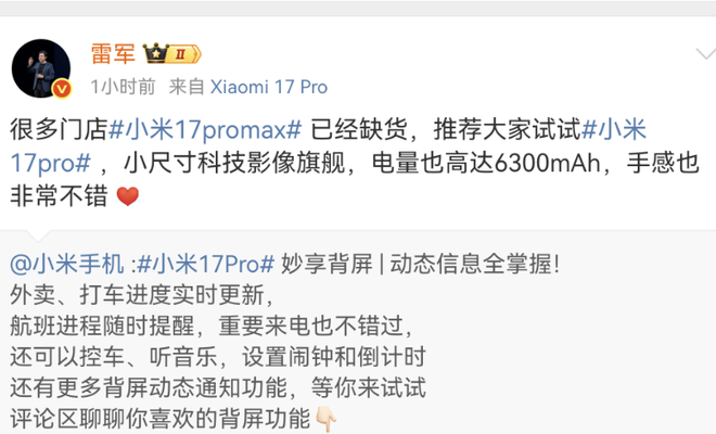 9月28日,雷军在微博表示,小米17 Pro Max在很多门店已经缺货,他推荐大家试试小米17 Pro,其手感也非常不错。