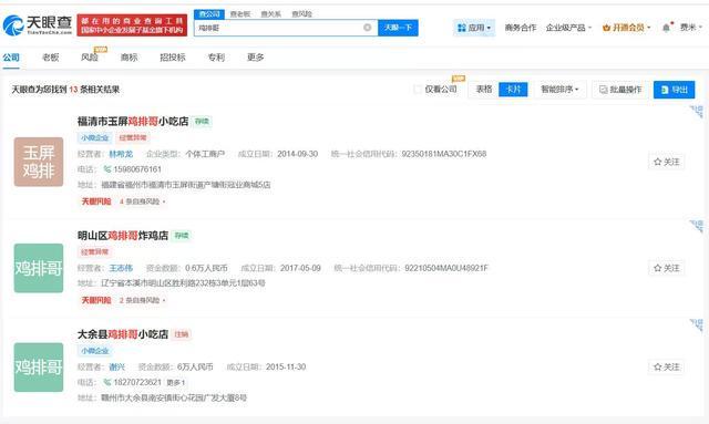 天眼查App显示,“鸡排哥”商标已被抢注,申请人包括上海一食品公司、北京一餐饮管理公司,国际分类涉及办公用品、广告销售、食品等,目前部分商标已成功注册。此外,已有多家公司以“鸡排哥”命名,包括福清市玉屏鸡排哥小吃店、明山区鸡排哥炸鸡店等。