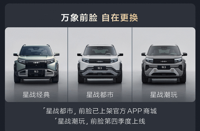 此外,今年8月方程豹汽车在成都车展期间发布的“变脸计划”,目前“星战都市”前脸已全面上架方程豹APP,“星战潮玩”前脸将于10月上新,可通过深度标准化及模块化结构设计实现前脸“无损更换”,且全新前脸均已通过工信部扩展公告的申报,完全符合国家法规要求。钛3还推出基于SUPER 3潮改方案延展的彩虹七色车衣,以及前备箱“电动加装”精品方案。方案面向新老车主开放,从一键开启到APP远程控制,随心升级。