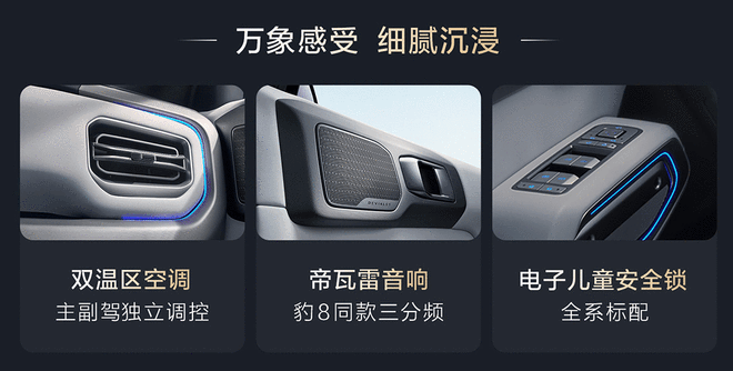 外观方面,钛3采用“星际战车”设计语言,前脸配备封闭式黑色格栅+平行LED日行灯,下包围集成毫米波雷达与银色装饰件,强化科技感。侧面采用隐藏式门把手+18英寸轮毂,车身尺寸为4605×1900×1720mm,轴距2745mm,提供2+3式的5座布局。其尾门采用侧开式设计,正中配备的背负式储物箱容积为28升,兼顾实用性与个性化。