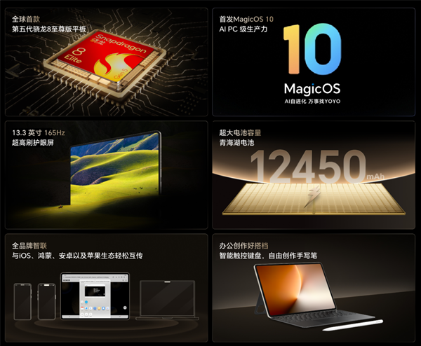 据了解,荣耀MagicPad3 Pro 13.3是全球首款第五代骁龙8至尊版平板,首发MagicOS 10,带来AI PC级生产力,配备13.3英寸165Hz高刷护眼屏、12450mAh青海湖电池。