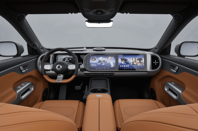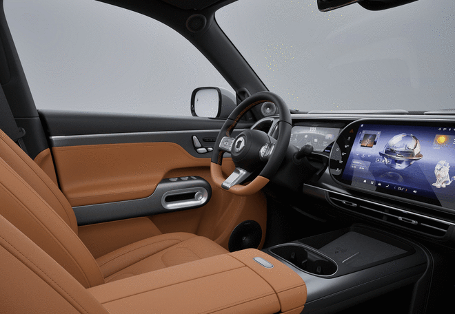 内饰上,全新smart精灵#5 EHD依然是融合科技感与功能性,打造更为宽敞舒适的内部空间,带来更智能的豪华智能座舱体验。配置方面,smart精灵#5 EHD配备25.6英寸AR-HUD、10.3英寸全彩超高清液晶仪表和双13英寸OLED显示屏,搭载AMD V2000车机芯片,内置smart OS 2.0系统,带来反应敏捷、视效绝伦的车机界面。smart系列车型的车机UI标配了“灵感星球”,以及新颖的3D造型精灵助手。