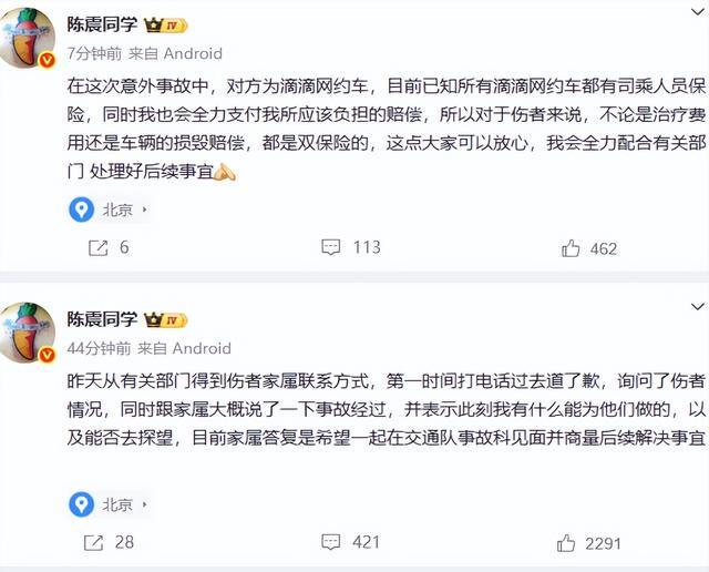 陈震转发贴文并道歉:发生这样的意外事故,给您和您的家庭造成了这么大的伤害,实在对不起,我会全力配合有关部门,做好后续工作以及补偿给您这边造成的损失,再次跟您道歉。
