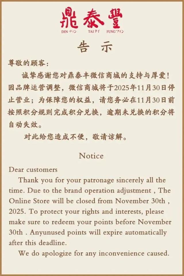10月10日,著名餐饮企业“鼎泰丰”发告示称,鼎泰丰微信商城将于2025年11月30日停止营业,顾客务必在11月30日前按照积分规则完成积分兑换,逾期未兑换的积分将自动失效。