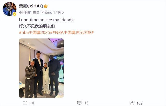 此前,奥尼尔曾发出几人的合影和视频,表示“好久不见,我的朋友们”“一个时代的同框,老友相见格外开心”。