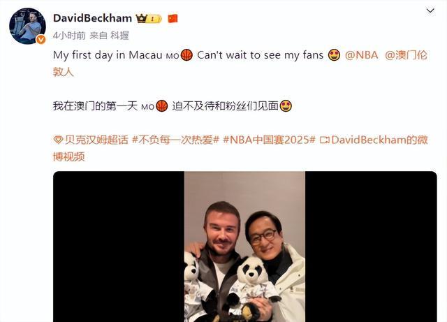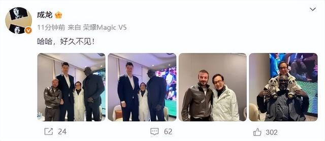 10月11日,影星成龙晒出与姚明、贝克汉姆、奥尼尔的合影,并配文称“哈哈,好久不见!”