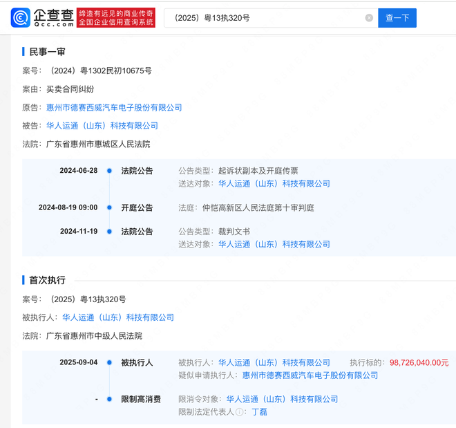 企查查APP显示,近日,华人运通(山东)科技有限公司及其法定代表人丁磊被限制高消费,案件流程显示此前华人运通(山东)科技有限公司已因此案分别被强制执行382万余元、9872万余元,执行法院均为广东省惠州市中级人民法院。