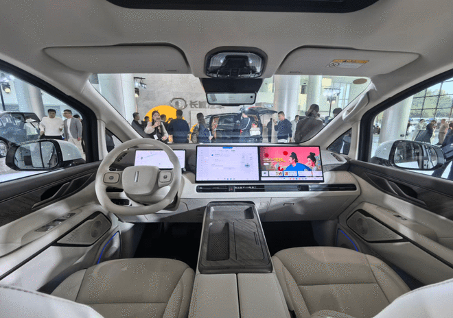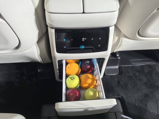 进入车内,前排采用双联屏设计,配备15.6英寸2.5K中控屏+副驾娱乐屏、12.3英寸仪表盘及26英寸HUD抬头显示,搭载Coffee OS 3智能系统与高通8295P芯片,支持六音区语音控制、手势交互及华为HiCar等互联功能。17.3英寸3K屏幕的后排娱乐屏为标配,同时还标配了二三排专属遮阳帘,并拥有净容积为12.5L的冰箱,冰箱采用前排扶手箱、后排抽屉式双开口设计,拿取更方便。