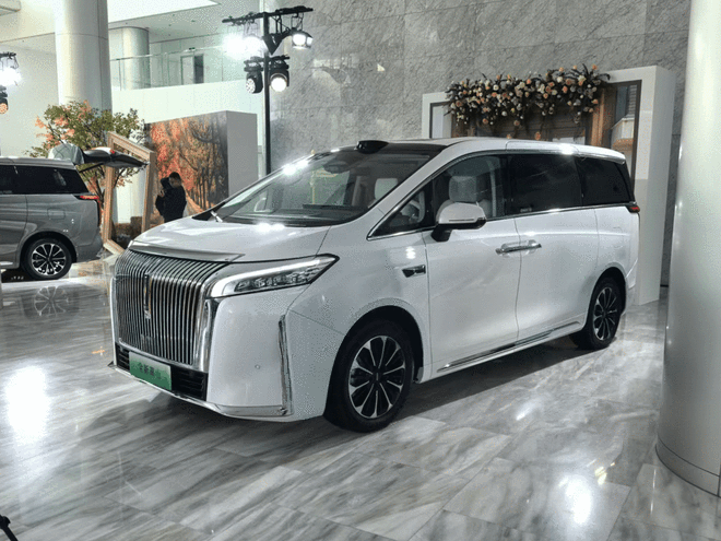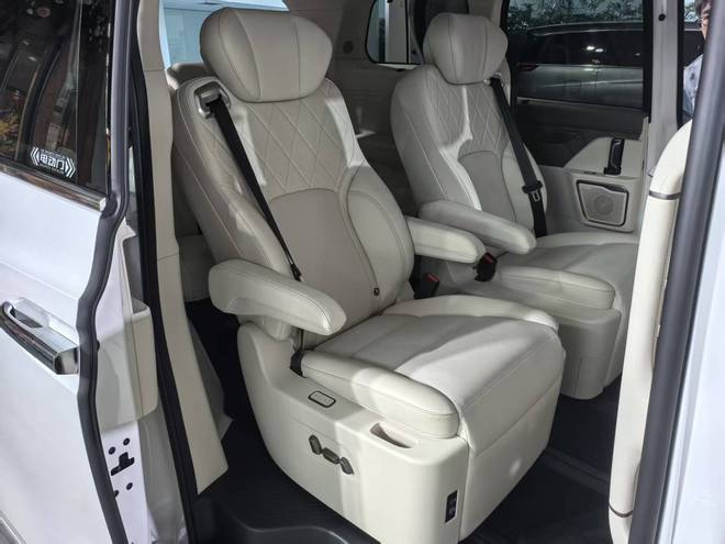 座椅布局为2+2+3的7座设计,第二排为独立航空座椅,支持电动调节、加热、通风,可选装零重力按摩座椅。后排配备吸顶娱乐屏、冷暖冰箱、折叠小桌板等,强调家庭出行的舒适性与便利性。