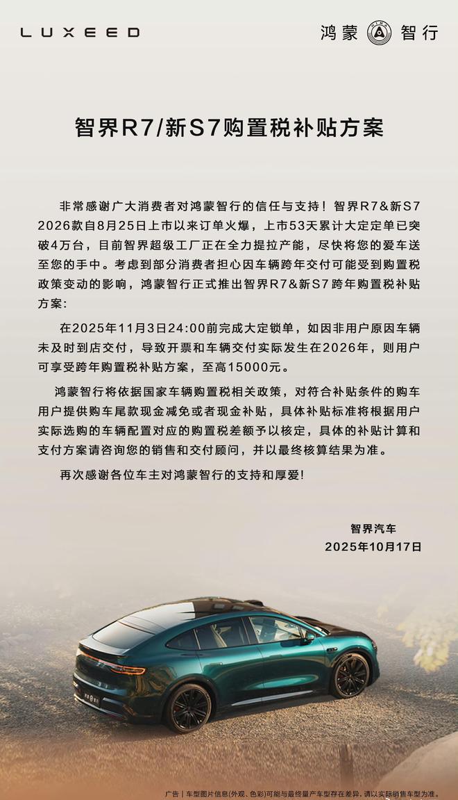 智界R7/S7购置税补贴方案,最高补贴达15000元兜底!