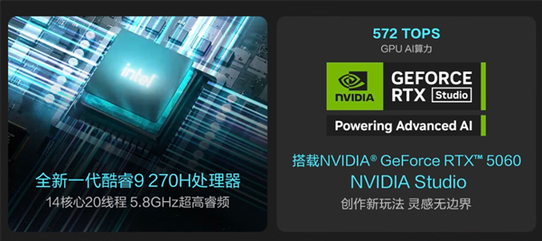 首先是处理器,它搭载全新英特尔酷睿9 270H标压处理器,采用更高能效的架构设计,多核性能相比上一代提升约15%。