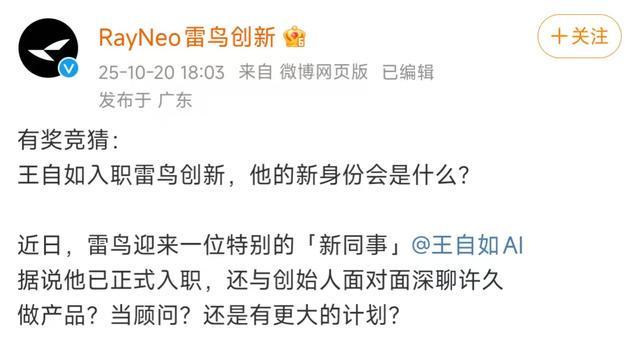 10月20日,雷鸟创新发文表示,近日,王自如已经入职雷鸟。