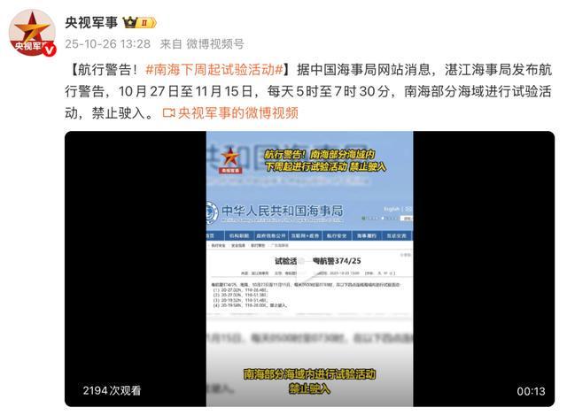 据中国海事局网站消息,湛江海事局发布航行警告,10月27日至11月15日,每天5时至7时30分,南海部分海域进行试验活动,禁止驶入。