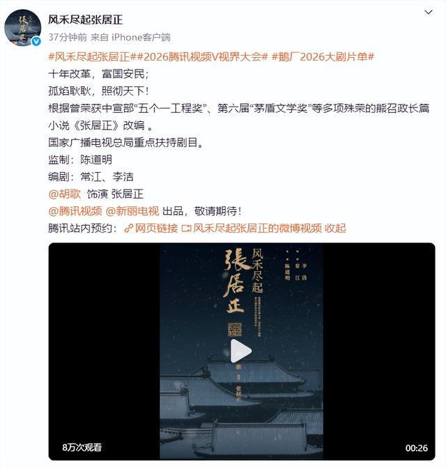 10月27日,电视剧《风禾尽起张居正》官宣阵容,由胡歌领衔主演,陈道明作为监制,常江、李洁担任编剧。