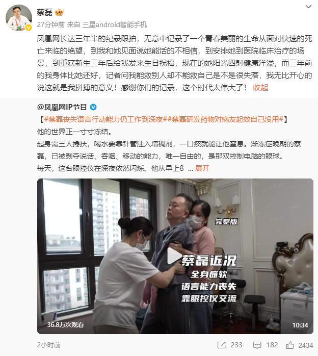 今年9月,蔡磊妻子段睿就曾透露其近况,称蔡磊已经完全没有语言能力了,胳膊、脚、脖子都无法活动,目前仅能吃一点流食。“如果他走了,我会真的很孤独”。