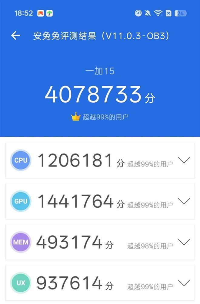 在安兔兔V11跑分测试中,一加15获得了407W分的好成绩,其中CPU+GPU总得分为264W分。