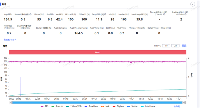 在烽火地带搜打撤一局游戏中,平均游戏帧数达到164.5FPS,稳帧指数0.5,1%low帧93FPS。