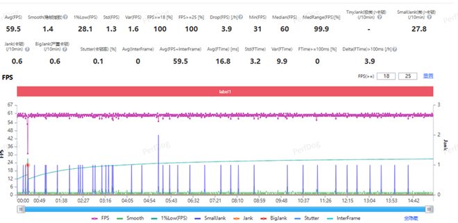 在崩铁大压力场景"黄金的时刻"全最高画质60帧跑图中。平均帧数为59.5FPS,稳帧指数1.4,1%low帧28.1FPS。