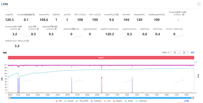 《王者荣耀》开启极致画质120帧,进行5V5天梯排位赛回放测试。平均帧数可达120.3FPS,稳帧指数0.1,1%low帧108.6FPS。