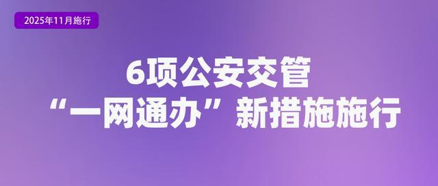 6项公安交管“一网通办”服务新措施于11月1日起施行。在便利群众用车方面,推出3项“一网通办”措施:一是网上办理解除机动车抵押登记。二是网上补换领机动车登记证书。三是推行机动车转籍信息网上转递。在便利群众考取驾驶证方面,推出2项“一网通办”措施:一是便利网上办理驾驶人考试业务。对无法按照预约时间参加驾驶人考试的,允许申请人通过“交管12123”App提前一天取消考试。二是便利网上申请校车驾驶资格。申请人可通过“交管12123”App申领校车驾驶资格,免予提交纸质申请材料。在服务行业企业发展方面,推出网上办理大件运输车辆临时号牌举措。
