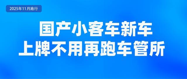 11月1日起,在全国全面推行国产小客车新车上牌“一件事”服务,推动车辆销售发票、购置税、保险等信息共享核查,实现国产小客车新车上牌全业务数字化办理,群众免予提交纸质材料。同时,在“交管12123”App开发应用新车上牌模块,网上集成选车、购险链接和选号、上牌等服务,实现新车信息联网共享,群众购置新车后不需要再到车管所验车,足不出户网办登记上牌。