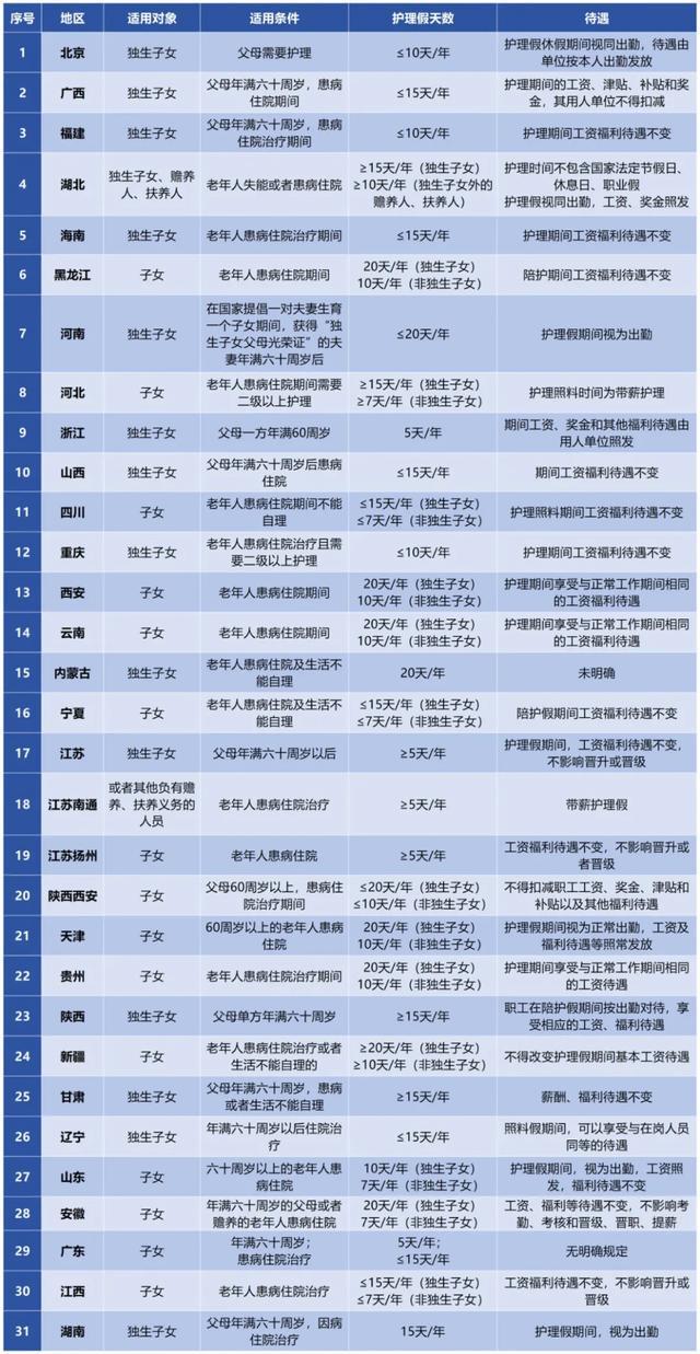 值得注意的是,湖北、山东、安徽等10余省份,非独生子女同样可享受护理假,不过假期天数少于独生子女。具体见下表: