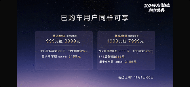 除了七大购车权益之外,长安马自达于今日还推出了基础套装和尊享套装的宠粉价。选购包括后备箱垫、脚垫和量子单车膜基础套装的用户,可以用999元抵3999元。而选择包括7kW家充装、脚垫、后备箱垫和量子单车膜尊享套装的用户,可以用1999元抵扣7999元。已购车的用户也能享受,此活动日期从11月1日到11月30日。