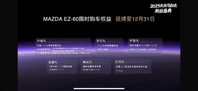 11月1日报道在今日晚间的2025长安马自达粉丝盛典上,长安马自达再次发布了MAZDA EZ-60的购车权益,和此前的上市权益一样,一共是七大购车权益,借粉丝节之际,官方将权益延续到12月31日,在次之前购车的用户均可享受。MAZDA EZ-60共推出6款车型,上市指导价区间为11.99-16.09万元。新车依旧传承“魂动”设计,以9风道实现空气动力学优化,打造电感“人马一体”驾控。