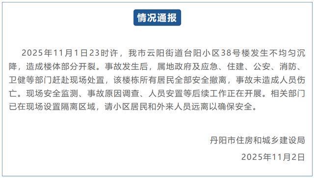 2025年11月1日23时许,我市云阳街道台阳小区38号楼发生不均匀沉降,造成楼体部分开裂。事故发生后,属地政府及应急、住建、公安、消防、卫健等部门赶赴现场处置,该楼栋所有居民全部安全撤离,事故未造成人员伤亡。