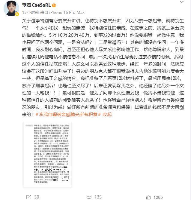 11月1日晚,李茂发文回应被骗一事,并晒出了法院立案的材料,自称虽掌握数百页刑事诈骗证据,但基于亲戚情分最后放弃了刑事诉讼,改为民事起诉。