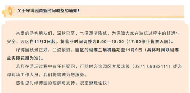 记者从郑州绿博园获悉,为保障游客游玩的舒适与安全,园区自今日(11月3日)起调整营业时间为9:00—18:00(17:00停止售票入园);当前园区秋景正盛、兰姿依旧,蝴蝶兰展将延期至11月9日(具体时间以蝴蝶兰实际花期为准)。