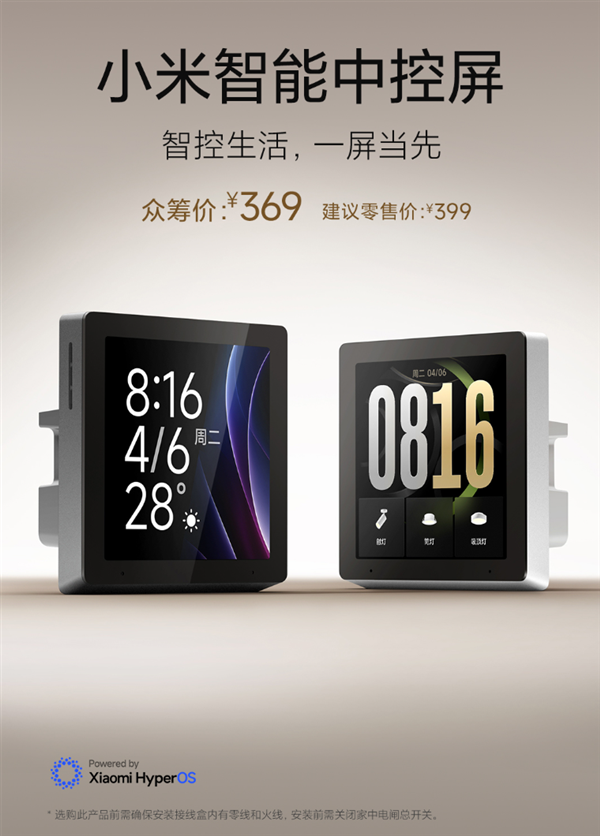 11月5日消息,今日,小米发布新款智能中控屏,建议零售价399元,众筹价369元,将于11月10日10:00开启众筹。