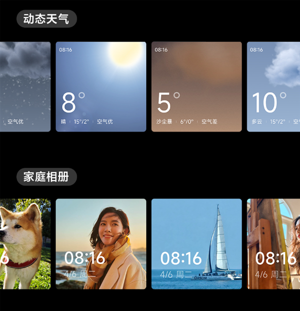 其他方面,小米智能中控屏采用24GHz毫米波雷达,靠近亮屏,支持光感,可设置动态天气、家庭相册等45款屏保。