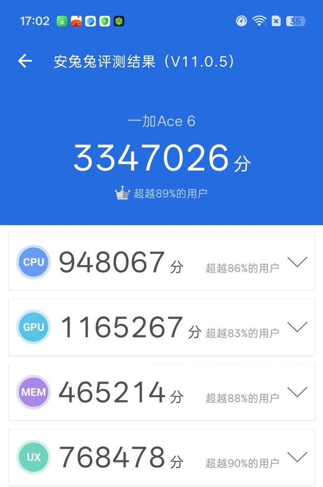 安兔兔V11的跑分达到了334W分,CPU+GPU分数达到了211W分,是搭载骁龙8至尊版的机型中最顶级的一批。