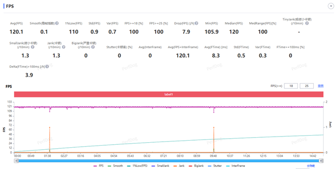 《王者荣耀》进行一局120帧极致画质5V5回放,平均帧数120.1FPS,稳帧指数0.1,1%low帧110FPS。1%low帧相当强悍,游戏运行十分顺畅,除了在两场大型团战中略有掉帧意外,其余几乎是一条直线。