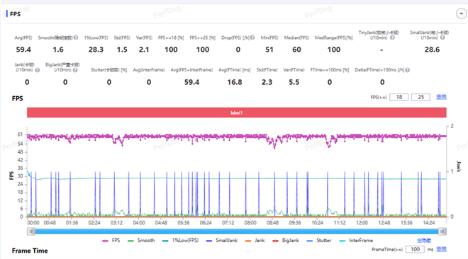 压力最大的崩铁还是略有困难,最高画质60帧,普通模式,可以达到59.4FPS的平均帧,稳帧指数1.6,1%low28.3FPS,有几段比较持续性的掉帧,小波动也不少。