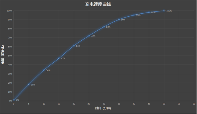 5分钟充入18%,10分钟充入34%,20分钟充入61%,半小时充入82%,充满用时50分钟。