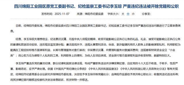 日前,经绵阳市委批准,绵阳市纪委监委对四川绵阳工业园区原党工委副书记、纪检监察工委书记李玉琼严重违纪违法问题进行了立案审查调查。