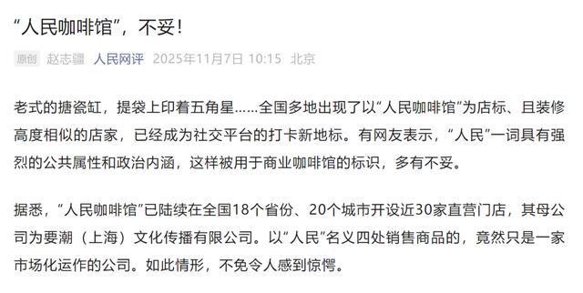 11月7日,人民网评发文《“人民咖啡馆”,不妥!》: