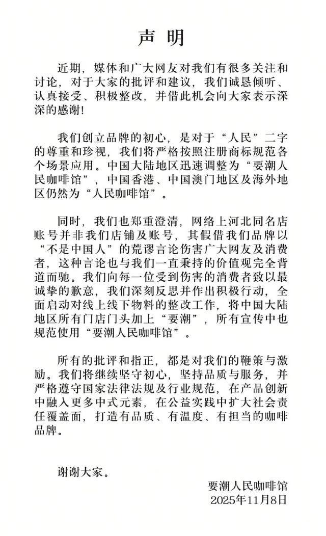 人民咖啡馆更名致歉声明,中国大陆地区调整为要潮人民咖啡馆