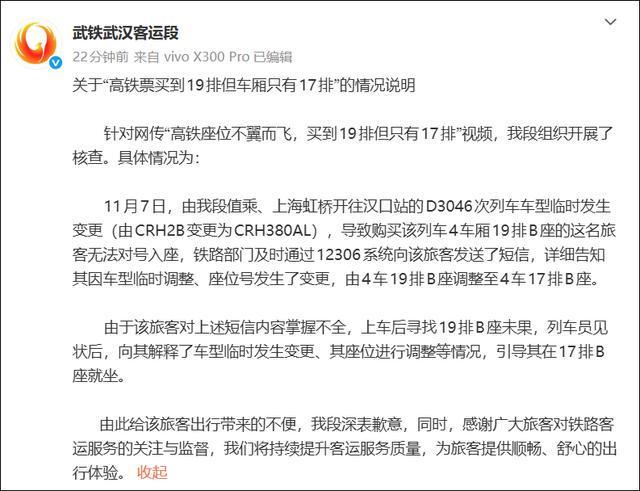 针对网传“高铁座位不翼而飞,买到19排但只有17排”视频,我段组织开展了核查。具体情况为:11月7日,由我段值乘、上海虹桥开往汉口站的D3046次列车车型临时发生变更(由CRH2B变更为CRH380AL),导致购买该列车4车厢19排B座的这名旅客无法对号入座,铁路部门及时通过12306系统向该旅客发送了短信,详细告知其因车型临时调整、座位号发生了变更,由4车19排B座调整至4车17排B座。由于该旅客对上述短信内容掌握不全,上车后寻找19排B座未果,列车员见状后,向其解释了车型临时发生变更、其座位进行调整等情况,引导其在17排B座就坐。由此给该旅客出行带来的不便,我段深表歉意,同时,感谢广大旅客对铁路客运服务的关注与监督,我们将持续提升客运服务质量,为旅客提供顺畅、舒心的出行体验。