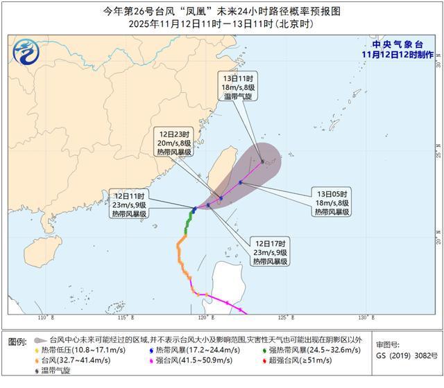 今年第26号台风“凤凰”(热带风暴级)今天10时位于瑞安南偏西方向约695公里的南海东北部海面上,就是北纬21.7度、东经119.3度,中心附近最大风力9级(23米/秒),中心最低气压为990百帕,七级风圈半径150~240公里。预计,“凤凰”将以每小时10~15公里的速度向东北方向移动,强度继续减弱,将于今天傍晚到夜里在台湾岛南部沿海登陆(热带风暴级,8~9级,20~23米/秒)或擦过,之后逐渐变性为温带气旋。