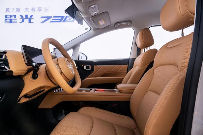 内饰方面,新车环抱式座舱设计风格简洁,搭载悬浮式仪表屏和12.8英寸悬浮式中控屏,支持车机互联,更有小憩、露营、离车不下电等多场景模式满足不同需求。星光730采用“2+2+3”的7座布局,全车座椅支持不同调节模式。